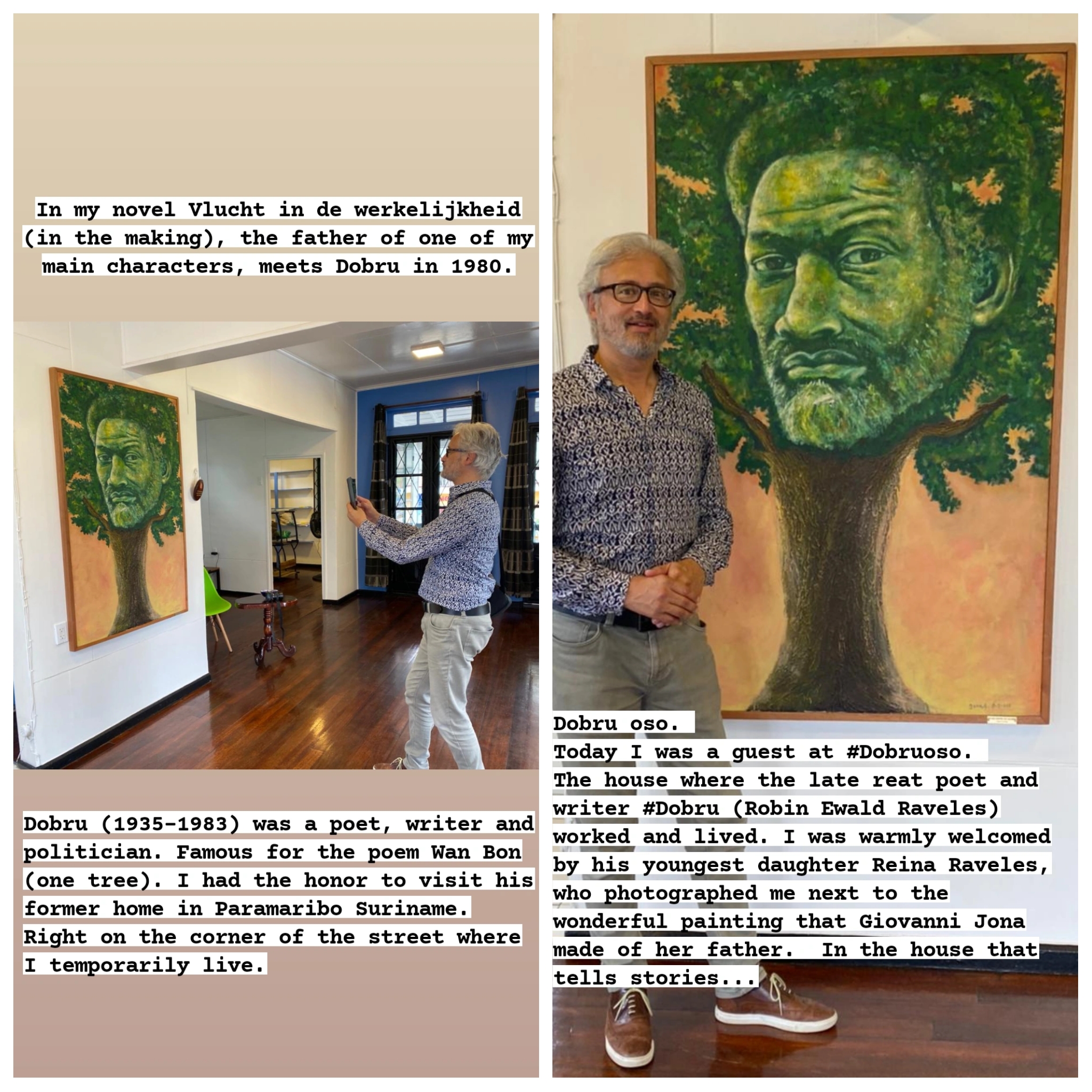 Voorjaar 2022 maakte ik kennis met zijn jongste dochter Reina Raveles. Ze leidde me rond in het voormalige woonhuis van haar ouders en liet daarbij de schrijfkamer van haar vader zien. ‘Het huis dat verhalen vertelt’ herbergt ook het geweldige schilderij dat Giovanni Jona van haar vader maakte, die met zijn gedichten (waaronder Wan) een nationale held werd. De zolder van het huis deed mijn schrijvershart sneller kloppen. Reina deelde haar eigen herinneringen aan de prille jaren tachtig met mij, die ze inmiddels ook aan het papier toevertrouwt. Dat de Surinaamse presentatie van mijn boek in Dobru oso plaats vindt is een grote eer. Had me geen andere plek kunnen voorstellen.