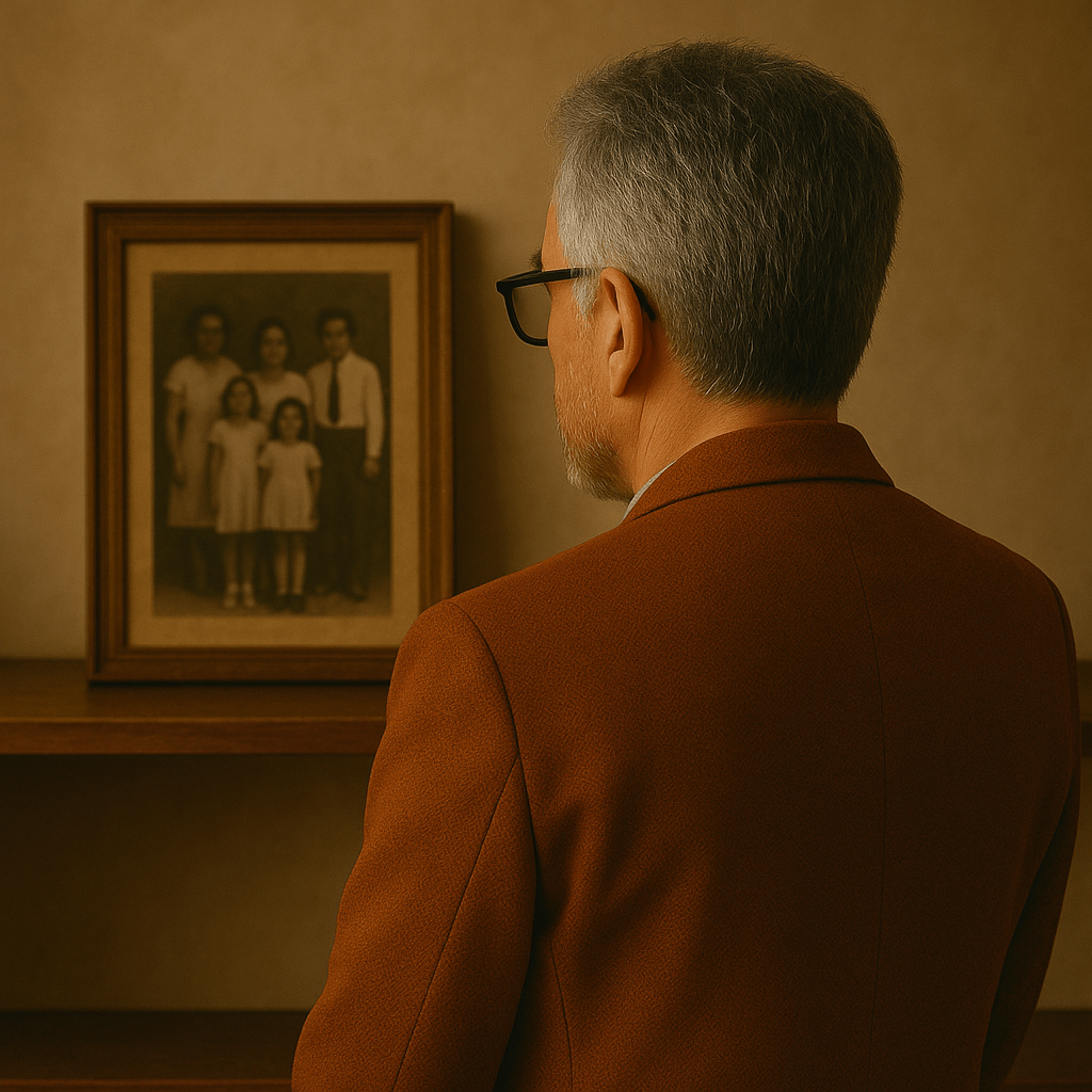 Een oude foto op de kast, met mensen erin die mij ooit kenden zoals ik hen. Hun blikken vangen mij zoals het licht hen ving op die dag die niemand zich nog echt herinnert en toch niet vergeten is.
