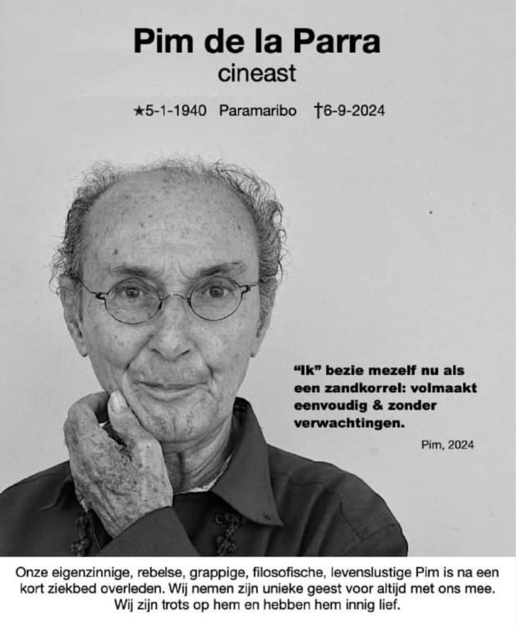 Vrijdag 13 september 2024 vierden familie, vrienden, bekenden, collega’s etc. het leven van cineast Pim de La Parra. Meneer Pim overleed op 6 september in Paramaribo op 84-jarige leeftijd.